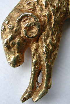 The oldest known one is in Munich at the Bayarische National Museum (No. 338), likely late 15th or beginning of 16th century, bronze gilt and very worn and battered from use. It is 9 cm wide and seems not well carved even when new. This fleece looks like it is still grazing grass. Below left.